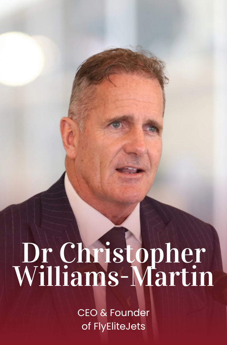 Dr Christopher Williams-Martin is a globally recognised leader in private aviation, with over 25 years at the forefront of the industry. As CEO and Founder of the multi award-winning FlyEliteJets, he has built a reputation for excellence, innovation, and delivering high-value aviation solutions on a global scale.